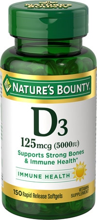 La vitamina D, la "vitamina del sol", es un nutriente esencial que el cuerpo produce a través de la luz solar. Sin embargo, la cultura actual de cubículos, protector solar, y casi todo el día la vida bajo techo minimiza nuestra exposición a la luz solar natural durante el tiempo necesario para que se forme suficiente vitamina D. Suplementar con Vitamina D3 de Nature's Bounty es una manera fácil de aumentar su ingesta diaria de este importante nutriente. Ayuda a fortalecer los huesos y la salud inmunológica*. La vitamina del sol.