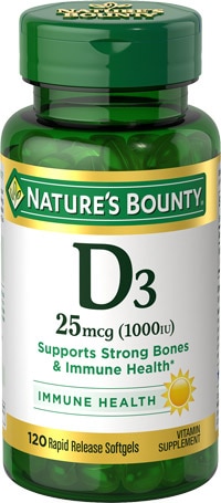 La vitamina D, la "vitamina del sol", es un nutriente esencial que el cuerpo produce a través de la luz solar. Sin embargo, la cultura actual de cubículos, protector solar, y casi todo el día la vida bajo techo minimiza nuestra exposición a la luz solar natural durante el tiempo necesario para que se forme suficiente vitamina D. Suplementar con Vitamina D3 de Nature's Bounty es una manera fácil de aumentar su ingesta diaria de este importante nutriente. Ayuda a fortalecer los huesos y la salud inmunológica*. La vitamina del sol.